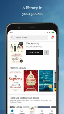 உங்கள் ஸ்மார்ட்போன் அல்லது டேப்லெட்டை ஒரு தனிப்பட்ட வாசிப்புப் புத்தகமாக **Kindle** மாற்றுகிறது. இதில் உங்கள் வசதிக்கேற்ப எழுத்துரு அளவு, வகை, வரம்புகள், உரை சீரமைப்பு மற்றும் திசையை (செங்குத்தாக அல்லது கிடைமட்டமாக) மாற்றியமைக்கலாம். பகல் அல்லது இரவு எந்த நேரத்திலும் வசதியாகப் படிக்க, வெளிச்சம் மற்றும் பின்னணி வண்ணங்களை சரிசெய்யும் வசதியும் உள்ளது. படிக்கும் போதே தெரியாத சொற்களை அகராதியைக் கொண்டு தெரிந்துகொள்ளலாம், விக்கிப்பீடியா தேடல்கள் மற்றும் உடனடி மொழிபெயர்ப்புகள் மூலம் ஆழமான தகவல்களைப் பெறலாம். நீங்கள் படித்து முடித்த புத்தகத்தின் சதவீதம், அத்தியாயத்தில் மீதமுள்ள நேரம் போன்ற உங்கள் வாசிப்பு முன்னேற்றத்தையும் கண்காணிக்கலாம். முக்கியமான பகுதிகளைக் குறித்து வைக்கலாம், குறிப்புகள் எடுக்கலாம், மேலும் 'Page Flip' அம்சத்தைப் பயன்படுத்தி பக்கங்களுக்கு இடையே எளிதாக மாறலாம். உயர் தெளிவுத்திறன் கொண்ட வண்ணப் படங்களை பெரிதாக்கிப் பார்க்கலாம். மேலும், உங்கள் வாசிப்பு முன்னேற்றம், புக்மார்க்குகள் மற்றும் குறிப்புகள் அனைத்தும் உங்கள் எல்லா சாதனங்களிலும் தானாகவே ஒத்திசைக்கப்படுவதால், ஒரு சாதனத்தில் நிறுத்திய இடத்திலிருந்து மற்றொரு சாதனத்தில் நீங்கள் மீண்டும் தொடங்கலாம்.
