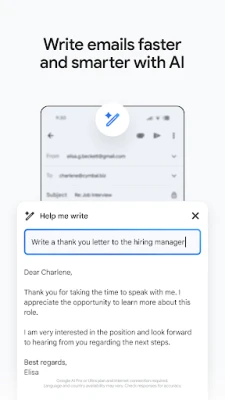 **Google Workspace** இன் ஒருங்கிணைந்த பகுதியான **Gmail**, உங்கள் குழுவின் உற்பத்தித்திறனை அடுத்த கட்டத்திற்குக் கொண்டு செல்கிறது. **Gmail** உள்ளிருந்தே Google Meet மூலம் கூட்டங்களை நடத்தலாம், Google Chat மூலம் உடனடி செய்தி அனுப்பலாம், Calendar அழைப்புகளுக்குப் பதிலளிக்கலாம் அல்லது ஒரு செயலை பணிப் பட்டியலுக்குச் சேர்க்கலாம். ஸ்மார்ட் கம்போஸ், இலக்கணப் பரிந்துரைகள் மற்றும் நினைவூட்டல்கள் போன்ற AI அடிப்படையிலான பரிந்துரைகள் உங்கள் நேரத்தைச் சேமித்து, நீங்கள் மிக முக்கியமான பணிகளில் கவனம் செலுத்த உதவுகின்றன. உங்கள் Wear OS வாட்ச்சில் **Gmail** காட்சிப்பகுதியையும் கட்டத்தையும் சேர்த்து, பயணத்தின்போதும் மின்னஞ்சல்களின் விரைவான மேலோட்டப் பார்வையைப் பெறுங்கள். **Gmail** மூலம் பாதுகாப்பான, திறமையான மற்றும் ஒத்துழைப்புடன் கூடிய மின்னஞ்சல் அனுபவத்தைப் பெறுங்கள்.