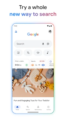 "டிஸ்கவர்" மூலம் உங்களுக்கு விருப்பமான தலைப்புகள் குறித்த சமீபத்திய செய்திகள், கட்டுரைகள் மற்றும் வீடியோக்களைக் கூகிள் வழங்குகிறது. தனிப்பயனாக்கப்பட்ட உள்ளடக்கத்துடன், காலை வானிலை முதல் முக்கிய செய்திகள், விளையாட்டு, திரைப்படங்கள் மற்றும் நிகழ்வுகள் குறித்த நிகழ்நேர அறிவிப்புகள் வரை அனைத்தையும் பெறுங்கள். உங்களுக்கு பிடித்த கலைஞர்களின் புதிய இசை வெளியீடுகள் மற்றும் உங்கள் பொழுதுபோக்குகள் பற்றிய கதைகள் என உங்களைப் புதுப்பித்த நிலையில் வைத்திருக்க உதவுகிறது. மேலும், கூகிள் விட்ஜெட்டைக் கொண்டு உங்கள் முகப்புத் திரையிலிருந்தே தேடலாம். உரையை மொழிபெயர்க்கவும், பாடல்களைத் தேடவும், வானிலையைப் பார்க்கவும் உங்கள் ஷார்ட்கட்களைத் தனிப்பயனாக்கலாம். உங்கள் தனிப்பட்ட ரசனைக்கு ஏற்ப அதன் நிறங்களையும் வெளிப்படைத்தன்மையையும் சரிசெய்யும் வசதியும் உள்ளது.