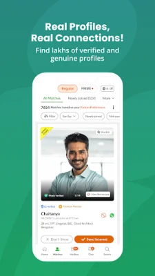 தினமும் ஆயிரக்கணக்கான கன்னடர்கள் கன்னட மேட்ரிமோனியில் பதிவு செய்து தங்கள் வாழ்க்கை துணையை தேடுகிறார்கள். லட்சக்கணக்கான திருமணப் பதிவுகள் இங்கு உள்ளன. இலவசப் பதிவு மூலம் உங்கள் Profileஐ உருவாக்கி, எண்ணற்ற பொருத்தமான இணைகளைக் கண்டறியலாம். எங்கள் சக்திவாய்ந்த MIMA™ எனும் AI-அடிப்படையிலான தேடல், உங்களுக்கு மிகவும் பொருந்தக்கூடிய துணைகளைப் பரிந்துரைக்கும். புதிய பொருத்தங்கள், ஆர்வம் அல்லது பதில் வரும்போது உடனடி அறிவிப்புகள் உங்கள் கைபேசியில் வந்து சேரும். மேம்பட்ட வடிகட்டிகள் மூலம் நகரம், கல்வி, தொழில் என உங்கள் விருப்பப்படி துல்லியமாகத் தேடலாம். பிரீமியம் உறுப்பினர் ஆவதன் மூலம், பாதுகாப்பான நேரடி உரையாடல் மற்றும் குரல் அழைப்பு அம்சங்கள் வழியாக இணைகளுடன் எந்த நேரத்திலும் தொடர்புகொள்ளலாம். "கன்னட மேட்ரிமோனி பிரைம்" மூலம் சரிபார்க்கப்பட்ட Profileகளை அணுகி, உங்கள் Profileஐ சிறப்பித்துக் காட்டி, இருப்பிடம், கல்வி, ஜாதகம் போன்ற முழுமையான விவரங்களையும் பார்க்கும் வாய்ப்பு கிடைக்கும்.