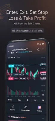 நிஃப்டி அல்லது பேங்க் நிஃப்டி ஆப்ஷன்களை ஸ்கால்பிங் செய்பவராக இருந்தாலும் அல்லது வேகமான பங்குகளைக் கண்காணிப்பவராக இருந்தாலும், சஹி உங்களது வர்த்தக அனுபவத்தை மாற்றியமைக்கிறது. சஹி ஸ்கேல்ப்பர் 2.0 ஒரே திரையில் ஆப்ஷன் ஸ்கால்பிங்கை விரைவாகவும் திறமையாகவும் செயல்படுத்துகிறது. வரைபடங்கள் மற்றும் ஆப்ஷன் சங்கிலியில் இருந்து ஆர்டர்களை ஒற்றை-கிளிக் மூலம் செயல்படுத்தவும், மாற்றியமைக்கவும் அல்லது வெளியேறவும் முடியும். உள்ளீர்ப்பு செய்யப்பட்ட குறைந்த லேடன்சி வரைபடங்களைப் பயன்படுத்தி, வர்த்தகங்களை நேரடியாக திரையில் இருந்து நிர்வகிப்பதற்கான வசதியுடன், ஸ்மார்ட் இடர் மேலாண்மை அம்சங்களான டிஃபால்ட் SL & டார்கெட் அல்லது தனிப்பயனாக்கப்பட்ட ட்ரெய்லிங் ஸ்டாப் லாஸ் (TSL) மூலம் லாபத்தைப் பாதுகாக்கலாம். ஒரே திரையில் இரண்டு வரைபடங்களைக் (கால்+புட் / இன்டெக்ஸ்+ஆப்ஷன்) பார்க்கும் வசதியால் திரை மாற்றுவதற்கான தேவையே இருக்காது.